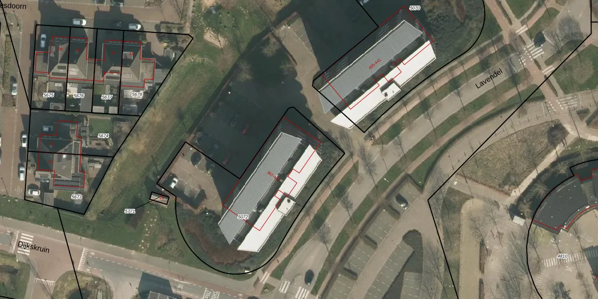 Het perceel waarop Lavendel 381 staat heeft een oppervlakte van 1789 m². Dit is een zeer groot perceel. De perceeloppervlakte wordt geregistreerd door het Kadaster. Gedetailleerde informatie over de maten van dit perceel kunt u vinden in het rapport Kadastrale kaart met maatvoering van Lavendel 381.