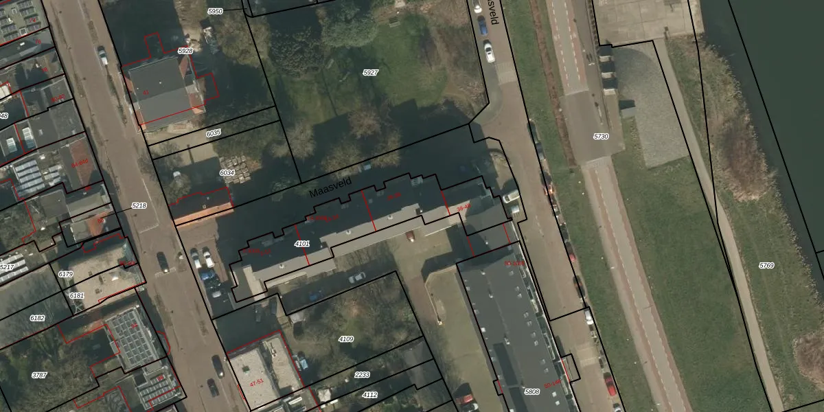 Maasveld 1012 is gelegen op kadastraal perceel CUI00C4101. Deze kadastrale aanduiding is uniek en wordt gebruikt door het Kadaster om eigendomsrechten en andere zakelijke rechten vast te leggen. Het perceel maakt onderdeel uit van de kadastrale gemeente Cuijk.