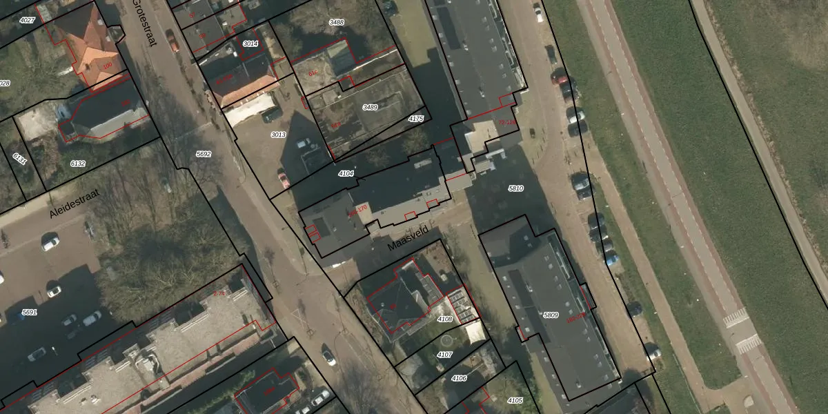 Maasveld 156 is gelegen op kadastraal perceel CUI00C4104. Deze kadastrale aanduiding is uniek en wordt gebruikt door het Kadaster om eigendomsrechten en andere zakelijke rechten vast te leggen. Het perceel maakt onderdeel uit van de kadastrale gemeente Cuijk.