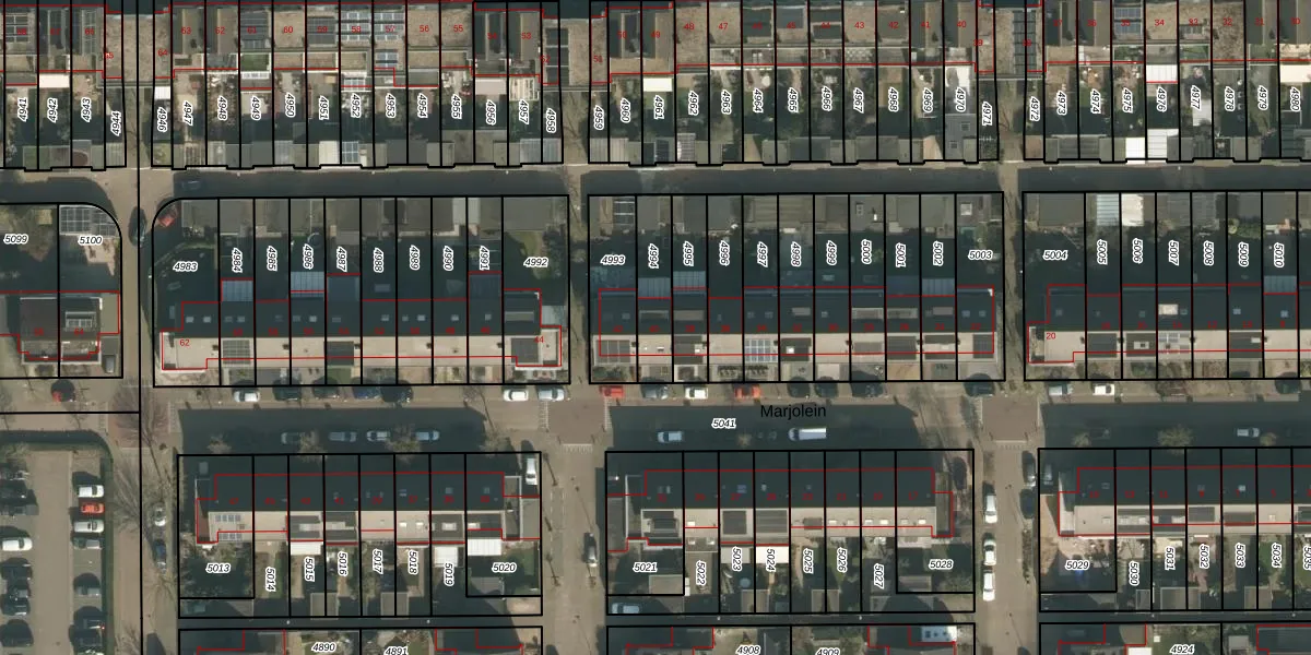 Het perceel waarop Marjolein 40 staat heeft een oppervlakte van 155 m². Dit is een middelgroot perceel. De perceeloppervlakte wordt geregistreerd door het Kadaster. Gedetailleerde informatie over de maten van dit perceel kunt u vinden in het rapport Kadastrale kaart met maatvoering van Marjolein 40.