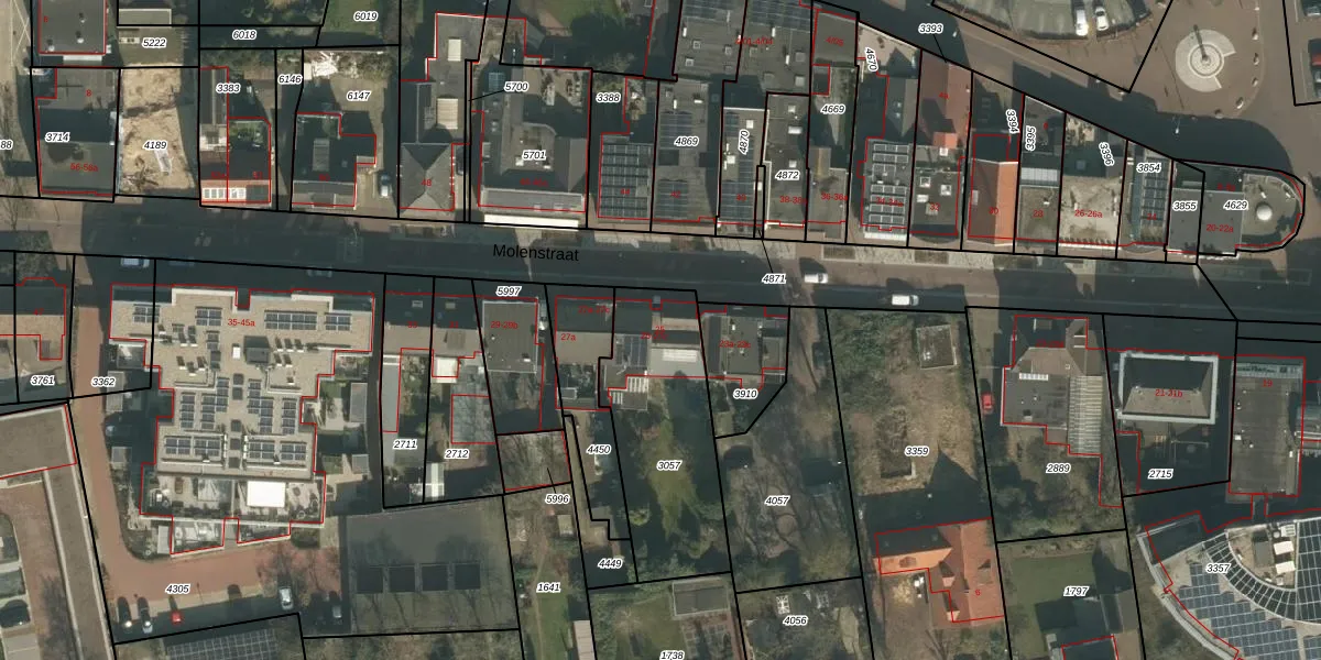 Het perceel waarop Molenstraat 25 staat heeft een oppervlakte van 640 m². Dit is een groot perceel. De perceeloppervlakte wordt geregistreerd door het Kadaster. Gedetailleerde informatie over de maten van dit perceel kunt u vinden in het rapport Kadastrale kaart met maatvoering van Molenstraat 25.