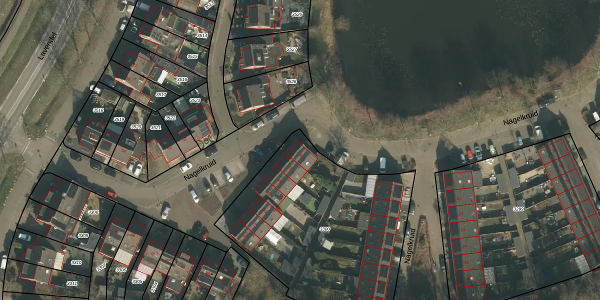 Het perceel waarop Nagelkruid 36 staat heeft een oppervlakte van 2533 m². Dit is een zeer groot perceel. De perceeloppervlakte wordt geregistreerd door het Kadaster. Gedetailleerde informatie over de maten van dit perceel kunt u vinden in het rapport Kadastrale kaart met maatvoering van Nagelkruid 36.