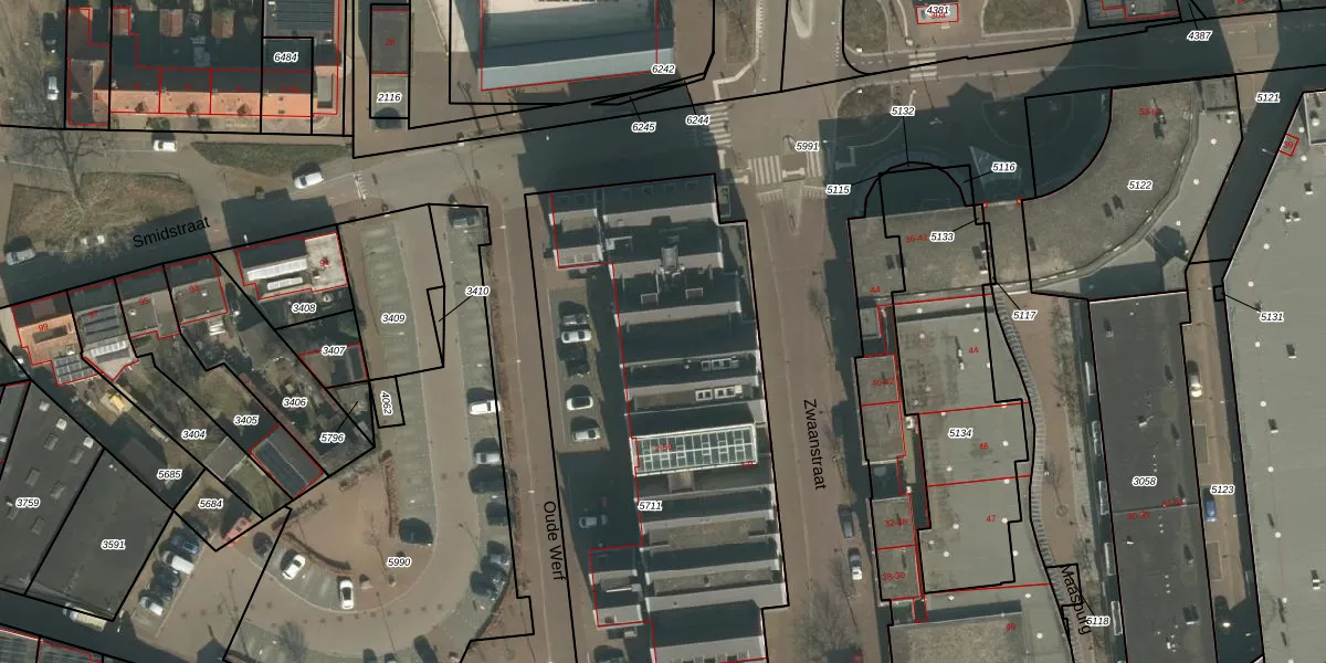 Het perceel waarop Oude Werf 42 staat heeft een oppervlakte van 3110 m². Dit is een zeer groot perceel. De perceeloppervlakte wordt geregistreerd door het Kadaster. Gedetailleerde informatie over de maten van dit perceel kunt u vinden in het rapport Kadastrale kaart met maatvoering van Oude Werf 42.