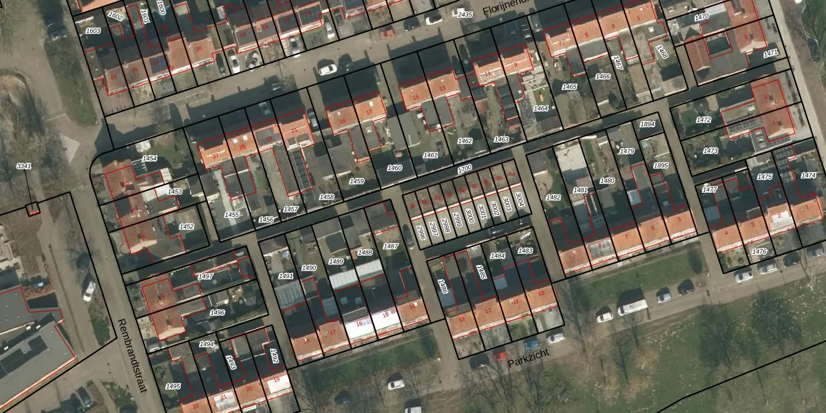 Het perceel waarop Parkzicht 9-i staat heeft een oppervlakte van 46 m². Dit is een klein perceel. De perceeloppervlakte wordt geregistreerd door het Kadaster. Gedetailleerde informatie over de maten van dit perceel kunt u vinden in het rapport Kadastrale kaart met maatvoering van Parkzicht 9-i.