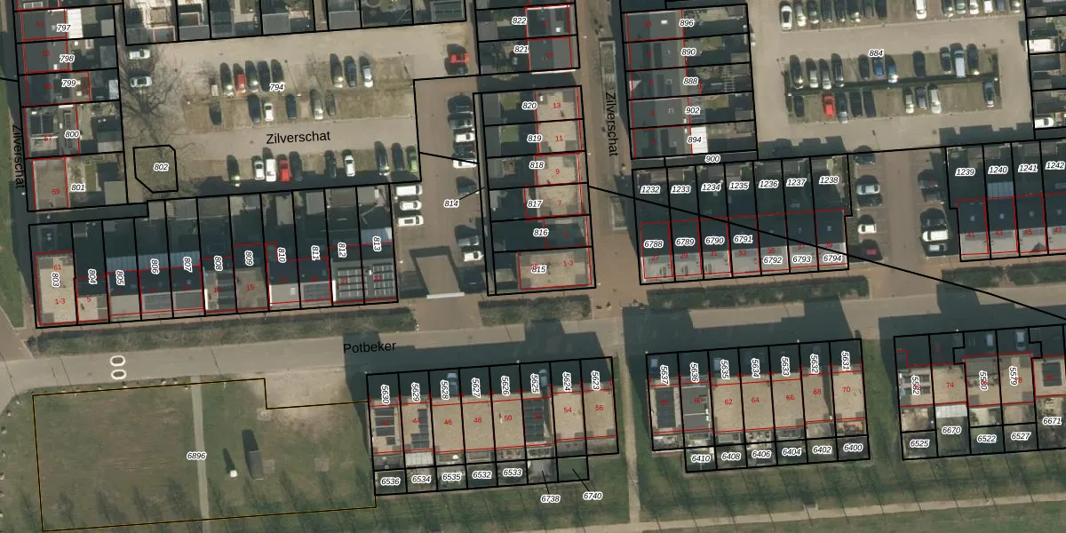 Het perceel waarop Potbeker 25 staat heeft een oppervlakte van 147 m². Dit is een middelgroot perceel. De perceeloppervlakte wordt geregistreerd door het Kadaster. Gedetailleerde informatie over de maten van dit perceel kunt u vinden in het rapport Kadastrale kaart met maatvoering van Potbeker 25.