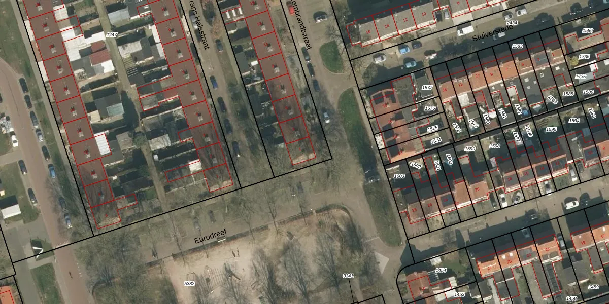 Het perceel waarop Rembrandtstraat 1 staat heeft een oppervlakte van 2375 m². Dit is een zeer groot perceel. De perceeloppervlakte wordt geregistreerd door het Kadaster. Gedetailleerde informatie over de maten van dit perceel kunt u vinden in het rapport Kadastrale kaart met maatvoering van Rembrandtstraat 1.