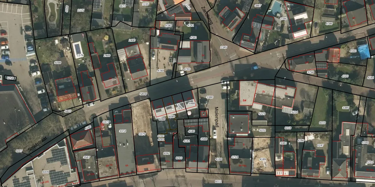 Smidstraat 107 is gelegen op kadastraal perceel CUI00C5988. Deze kadastrale aanduiding is uniek en wordt gebruikt door het Kadaster om eigendomsrechten en andere zakelijke rechten vast te leggen. Het perceel maakt onderdeel uit van de kadastrale gemeente Cuijk.