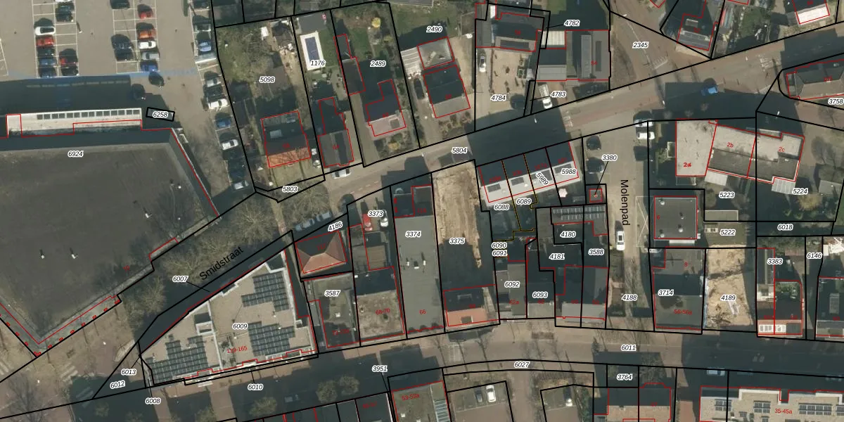 Het perceel waarop Smidstraat 115 staat heeft een oppervlakte van 354 m². Dit is een groot perceel. De perceeloppervlakte wordt geregistreerd door het Kadaster. Gedetailleerde informatie over de maten van dit perceel kunt u vinden in het rapport Kadastrale kaart met maatvoering van Smidstraat 115.