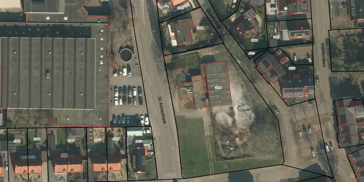 Het perceel waarop St Annastraat 4 staat heeft een oppervlakte van 3357 m². Dit is een zeer groot perceel. De perceeloppervlakte wordt geregistreerd door het Kadaster. Gedetailleerde informatie over de maten van dit perceel kunt u vinden in het rapport Kadastrale kaart met maatvoering van St Annastraat 4.