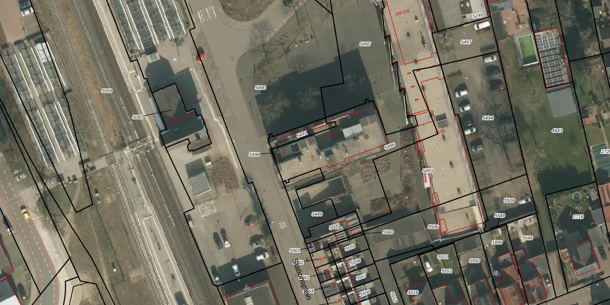 Het perceel waarop Stationsplein 104 staat heeft een oppervlakte van 1730 m². Dit is een zeer groot perceel. De perceeloppervlakte wordt geregistreerd door het Kadaster. Gedetailleerde informatie over de maten van dit perceel kunt u vinden in het rapport Kadastrale kaart met maatvoering van Stationsplein 104.