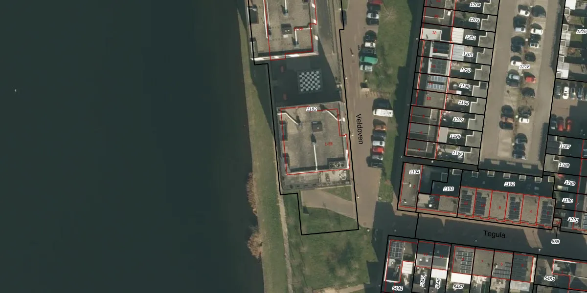 Het perceel waarop Veldoven 33 staat heeft een oppervlakte van 2182 m². Dit is een zeer groot perceel. De perceeloppervlakte wordt geregistreerd door het Kadaster. Gedetailleerde informatie over de maten van dit perceel kunt u vinden in het rapport Kadastrale kaart met maatvoering van Veldoven 33.