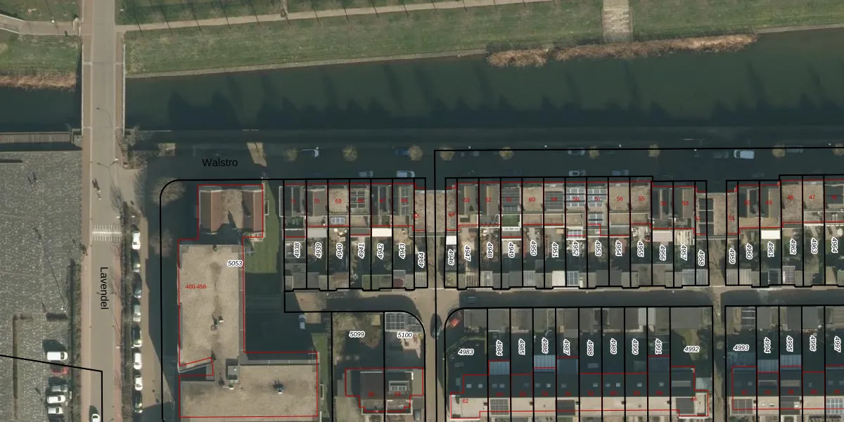 Het perceel waarop Walstro 65 staat heeft een oppervlakte van 74 m². Dit is een klein perceel. De perceeloppervlakte wordt geregistreerd door het Kadaster. Gedetailleerde informatie over de maten van dit perceel kunt u vinden in het rapport Kadastrale kaart met maatvoering van Walstro 65.