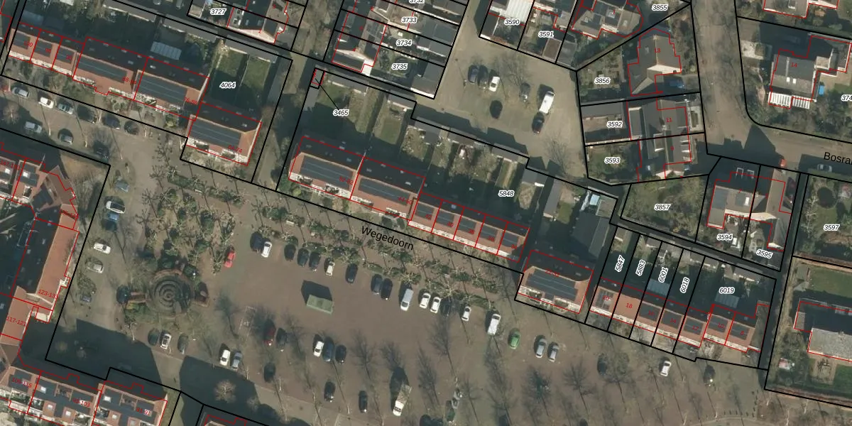 Het perceel waarop Wegedoorn 42 staat heeft een oppervlakte van 2199 m². Dit is een zeer groot perceel. De perceeloppervlakte wordt geregistreerd door het Kadaster. Gedetailleerde informatie over de maten van dit perceel kunt u vinden in het rapport Kadastrale kaart met maatvoering van Wegedoorn 42.