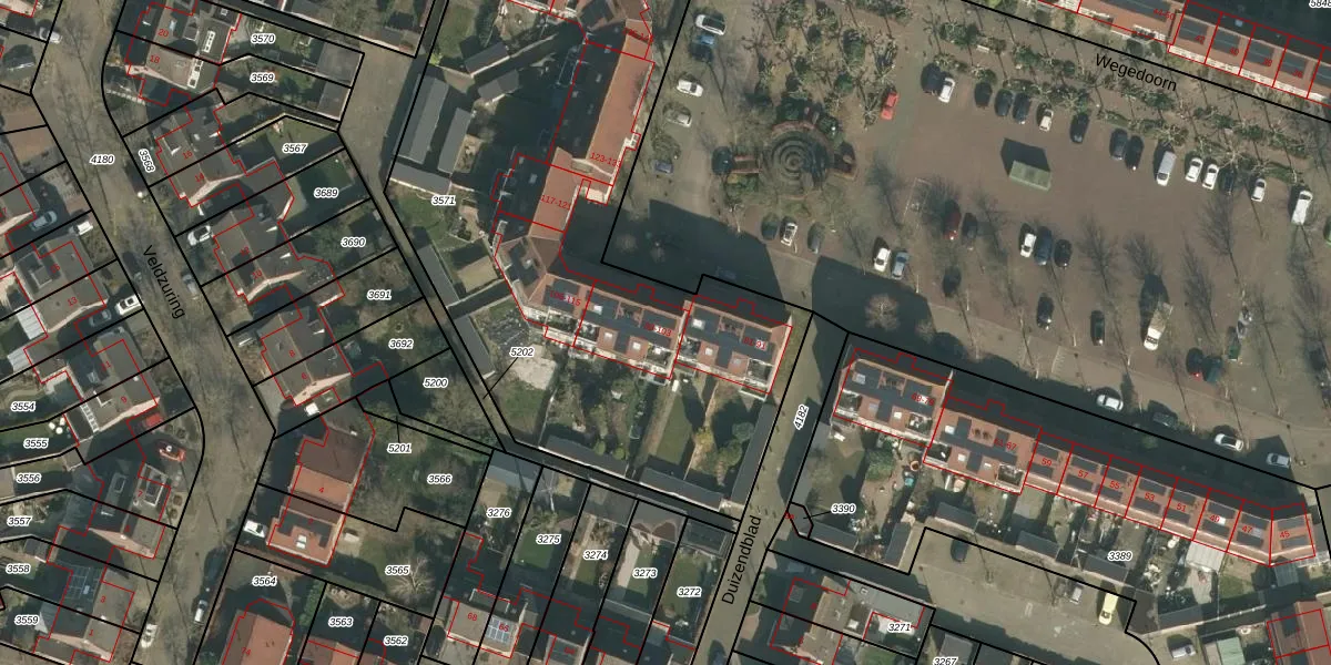 Het perceel waarop Wegedoorn 95 staat heeft een oppervlakte van 3250 m². Dit is een zeer groot perceel. De perceeloppervlakte wordt geregistreerd door het Kadaster. Gedetailleerde informatie over de maten van dit perceel kunt u vinden in het rapport Kadastrale kaart met maatvoering van Wegedoorn 95.