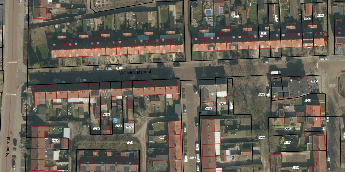 Het perceel waarop Wilhelminastraat 42 staat heeft een oppervlakte van 5707 m². Dit is een zeer groot perceel. De perceeloppervlakte wordt geregistreerd door het Kadaster. Gedetailleerde informatie over de maten van dit perceel kunt u vinden in het rapport Kadastrale kaart met maatvoering van Wilhelminastraat 42.