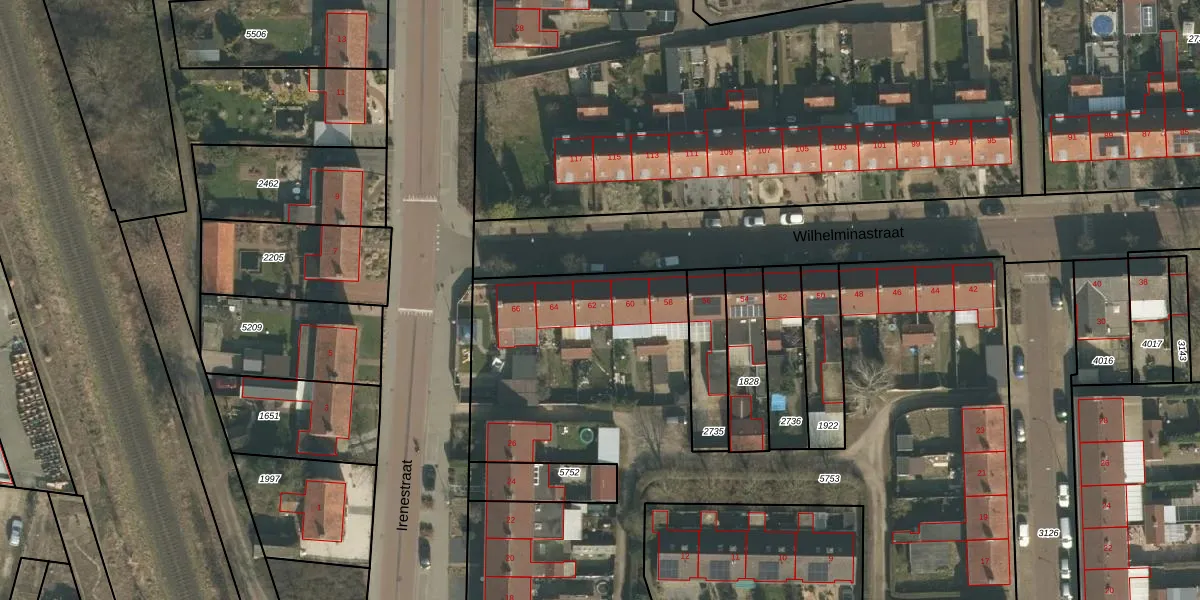 Het perceel waarop Wilhelminastraat 62 staat heeft een oppervlakte van 5707 m². Dit is een zeer groot perceel. De perceeloppervlakte wordt geregistreerd door het Kadaster. Gedetailleerde informatie over de maten van dit perceel kunt u vinden in het rapport Kadastrale kaart met maatvoering van Wilhelminastraat 62.
