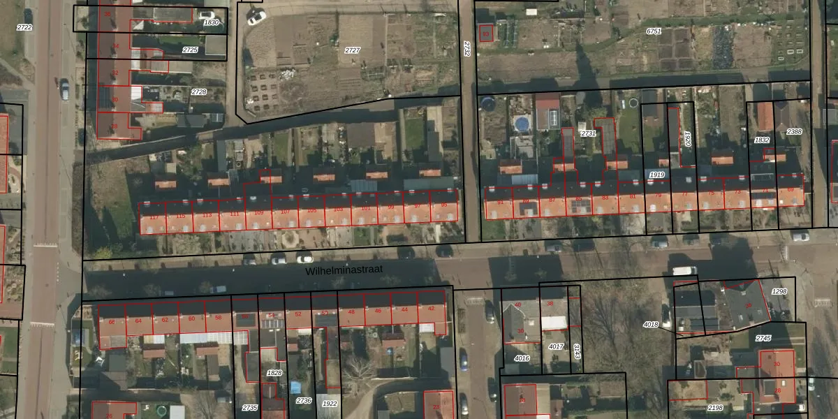 Het perceel waarop Wilhelminastraat 97 staat heeft een oppervlakte van 5548 m². Dit is een zeer groot perceel. De perceeloppervlakte wordt geregistreerd door het Kadaster. Gedetailleerde informatie over de maten van dit perceel kunt u vinden in het rapport Kadastrale kaart met maatvoering van Wilhelminastraat 97.