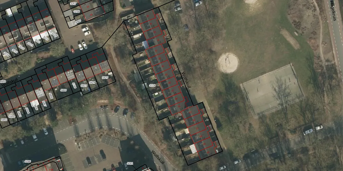 Het perceel waarop Wolfskuil 45 staat heeft een oppervlakte van 2003 m². Dit is een zeer groot perceel. De perceeloppervlakte wordt geregistreerd door het Kadaster. Gedetailleerde informatie over de maten van dit perceel kunt u vinden in het rapport Kadastrale kaart met maatvoering van Wolfskuil 45.