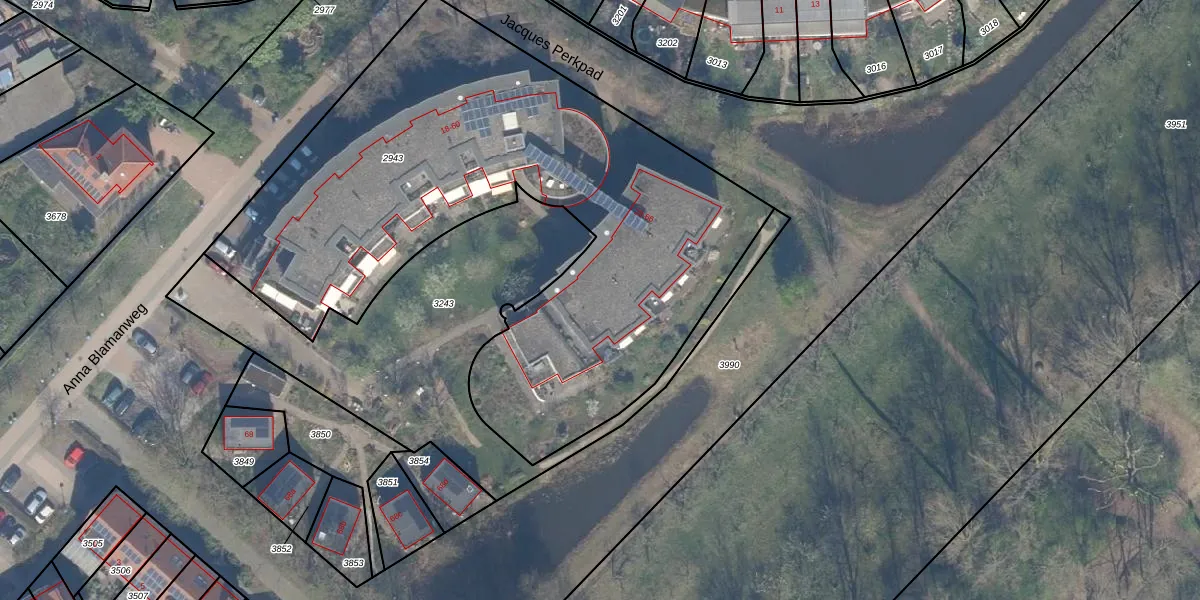 Het perceel waarop Anna Blamanweg 54 staat heeft een oppervlakte van 3255 m². Dit is een zeer groot perceel. De perceeloppervlakte wordt geregistreerd door het Kadaster. Gedetailleerde informatie over de maten van dit perceel kunt u vinden in het rapport Kadastrale kaart met maatvoering van Anna Blamanweg 54.
