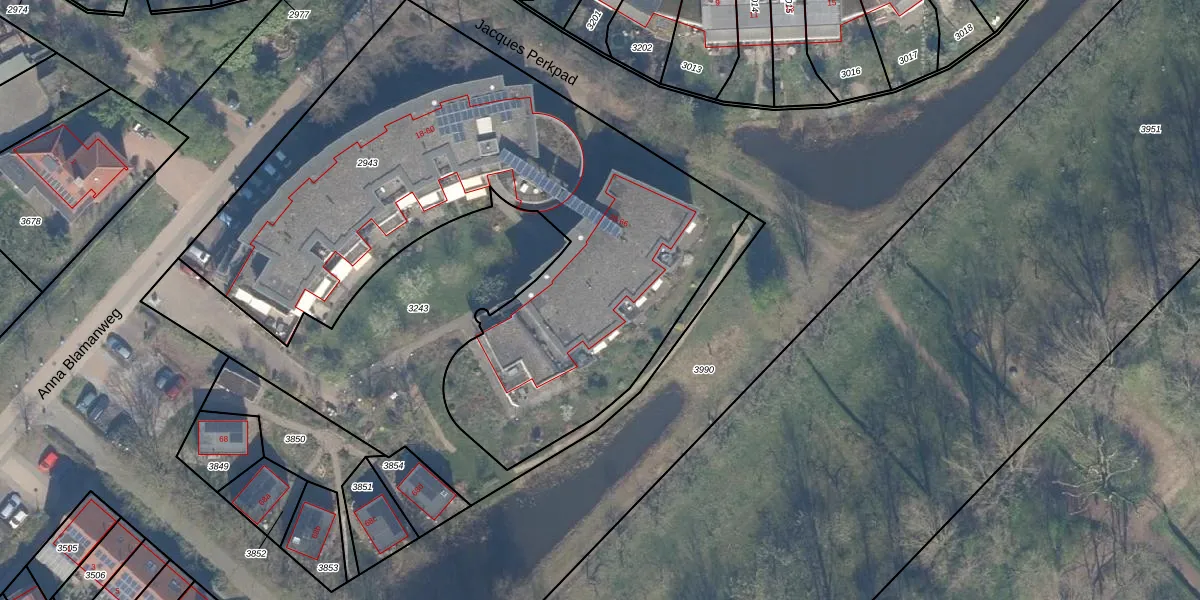 Het perceel waarop Anna Blamanweg 66 staat heeft een oppervlakte van 3255 m². Dit is een zeer groot perceel. De perceeloppervlakte wordt geregistreerd door het Kadaster. Gedetailleerde informatie over de maten van dit perceel kunt u vinden in het rapport Kadastrale kaart met maatvoering van Anna Blamanweg 66.