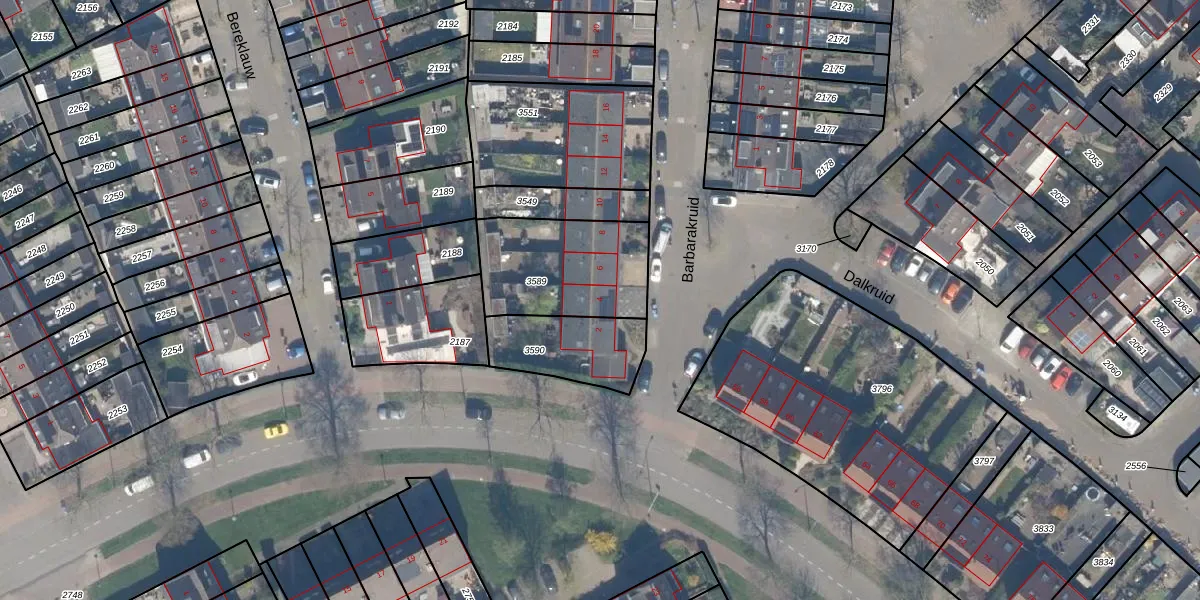 Het perceel waarop Barbarakruid 4 staat heeft een oppervlakte van 449 m². Dit is een groot perceel. De perceeloppervlakte wordt geregistreerd door het Kadaster. Gedetailleerde informatie over de maten van dit perceel kunt u vinden in het rapport Kadastrale kaart met maatvoering van Barbarakruid 4.