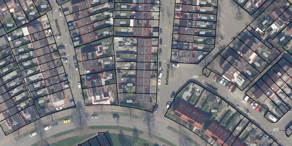 Het perceel waarop Barbarakruid 8 staat heeft een oppervlakte van 449 m². Dit is een groot perceel. De perceeloppervlakte wordt geregistreerd door het Kadaster. Gedetailleerde informatie over de maten van dit perceel kunt u vinden in het rapport Kadastrale kaart met maatvoering van Barbarakruid 8.