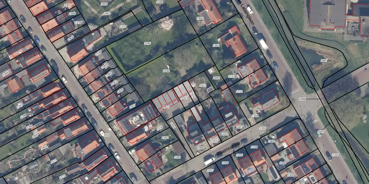 Het perceel waarop Beatrixstraat 12-f staat heeft een oppervlakte van 82 m². Dit is een klein perceel. De perceeloppervlakte wordt geregistreerd door het Kadaster. Gedetailleerde informatie over de maten van dit perceel kunt u vinden in het rapport Kadastrale kaart met maatvoering van Beatrixstraat 12-f.