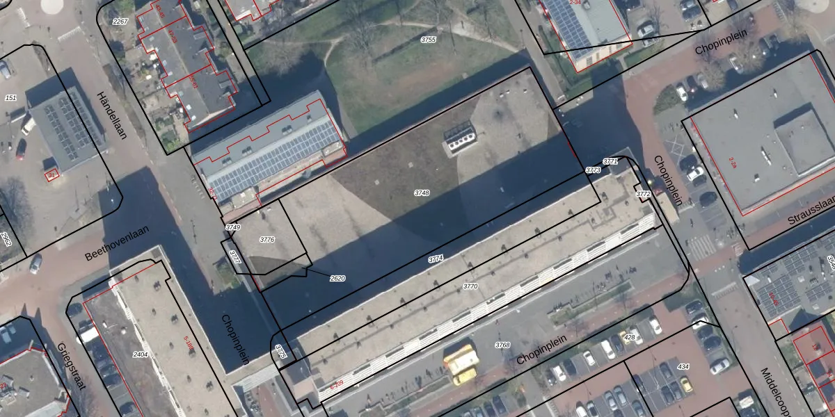 Het perceel waarop Chopinplein 145 staat heeft een oppervlakte van 2065 m². Dit is een zeer groot perceel. De perceeloppervlakte wordt geregistreerd door het Kadaster. Gedetailleerde informatie over de maten van dit perceel kunt u vinden in het rapport Kadastrale kaart met maatvoering van Chopinplein 145.