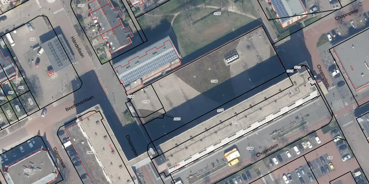 Het perceel waarop Chopinplein 167 staat heeft een oppervlakte van 2065 m². Dit is een zeer groot perceel. De perceeloppervlakte wordt geregistreerd door het Kadaster. Gedetailleerde informatie over de maten van dit perceel kunt u vinden in het rapport Kadastrale kaart met maatvoering van Chopinplein 167.