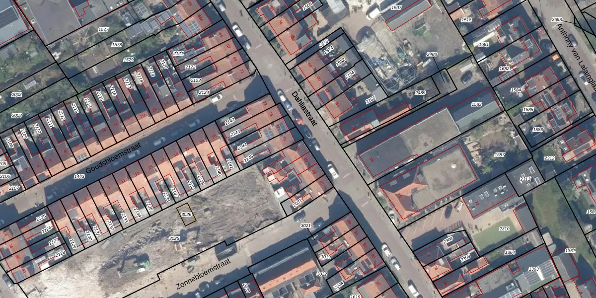 Het perceel waarop Dahliastraat 81 staat heeft een oppervlakte van 2030 m². Dit is een zeer groot perceel. De perceeloppervlakte wordt geregistreerd door het Kadaster. Gedetailleerde informatie over de maten van dit perceel kunt u vinden in het rapport Kadastrale kaart met maatvoering van Dahliastraat 81.