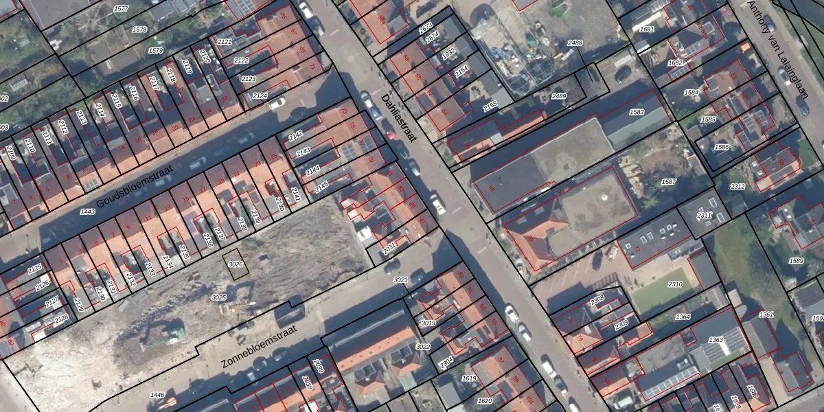 Het perceel waarop Dahliastraat 85 staat heeft een oppervlakte van 2030 m². Dit is een zeer groot perceel. De perceeloppervlakte wordt geregistreerd door het Kadaster. Gedetailleerde informatie over de maten van dit perceel kunt u vinden in het rapport Kadastrale kaart met maatvoering van Dahliastraat 85.