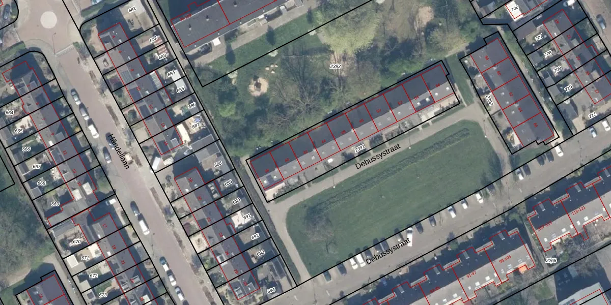 Het perceel waarop Debussystraat 42 staat heeft een oppervlakte van 1080 m². Dit is een zeer groot perceel. De perceeloppervlakte wordt geregistreerd door het Kadaster. Gedetailleerde informatie over de maten van dit perceel kunt u vinden in het rapport Kadastrale kaart met maatvoering van Debussystraat 42.