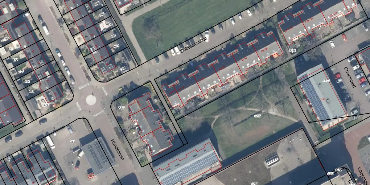 Het perceel waarop Debussystraat 69 staat heeft een oppervlakte van 2990 m². Dit is een zeer groot perceel. De perceeloppervlakte wordt geregistreerd door het Kadaster. Gedetailleerde informatie over de maten van dit perceel kunt u vinden in het rapport Kadastrale kaart met maatvoering van Debussystraat 69.