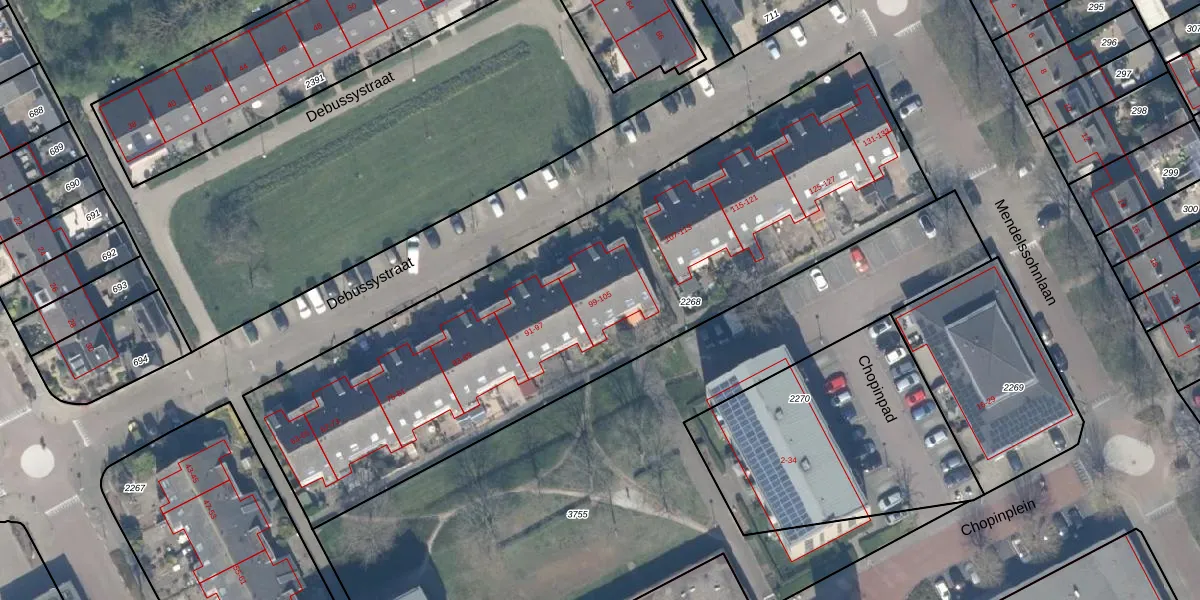 Het perceel waarop Debussystraat 99 staat heeft een oppervlakte van 2990 m². Dit is een zeer groot perceel. De perceeloppervlakte wordt geregistreerd door het Kadaster. Gedetailleerde informatie over de maten van dit perceel kunt u vinden in het rapport Kadastrale kaart met maatvoering van Debussystraat 99.