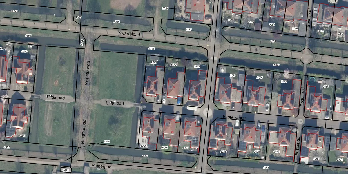 Het perceel waarop Eksterstraat 20 staat heeft een oppervlakte van 321 m². Dit is een groot perceel. De perceeloppervlakte wordt geregistreerd door het Kadaster. Gedetailleerde informatie over de maten van dit perceel kunt u vinden in het rapport Kadastrale kaart met maatvoering van Eksterstraat 20.