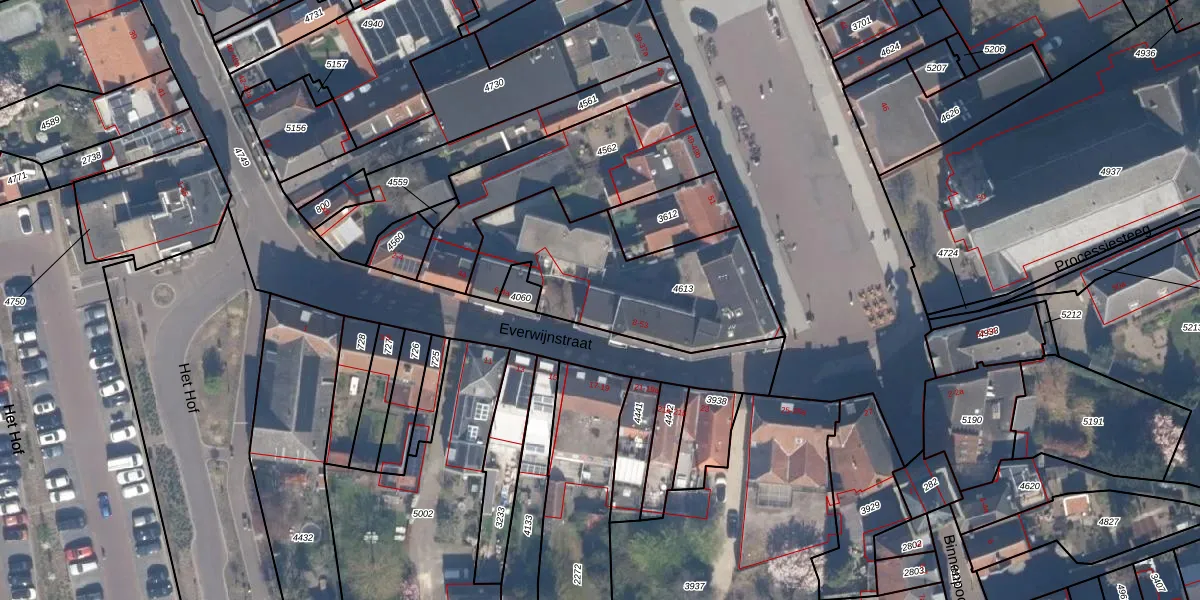 Het perceel waarop Everwijnstraat 16 staat heeft een oppervlakte van 781 m². Dit is een groot perceel. De perceeloppervlakte wordt geregistreerd door het Kadaster. Gedetailleerde informatie over de maten van dit perceel kunt u vinden in het rapport Kadastrale kaart met maatvoering van Everwijnstraat 16.