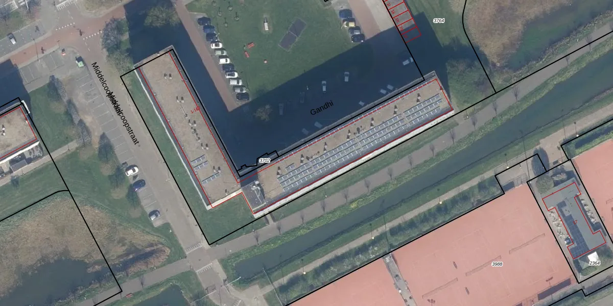 Het perceel waarop Gandhi 105 staat heeft een oppervlakte van 6120 m². Dit is een zeer groot perceel. De perceeloppervlakte wordt geregistreerd door het Kadaster. Gedetailleerde informatie over de maten van dit perceel kunt u vinden in het rapport Kadastrale kaart met maatvoering van Gandhi 105.