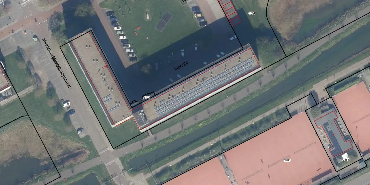 Het perceel waarop Gandhi 115 staat heeft een oppervlakte van 6120 m². Dit is een zeer groot perceel. De perceeloppervlakte wordt geregistreerd door het Kadaster. Gedetailleerde informatie over de maten van dit perceel kunt u vinden in het rapport Kadastrale kaart met maatvoering van Gandhi 115.