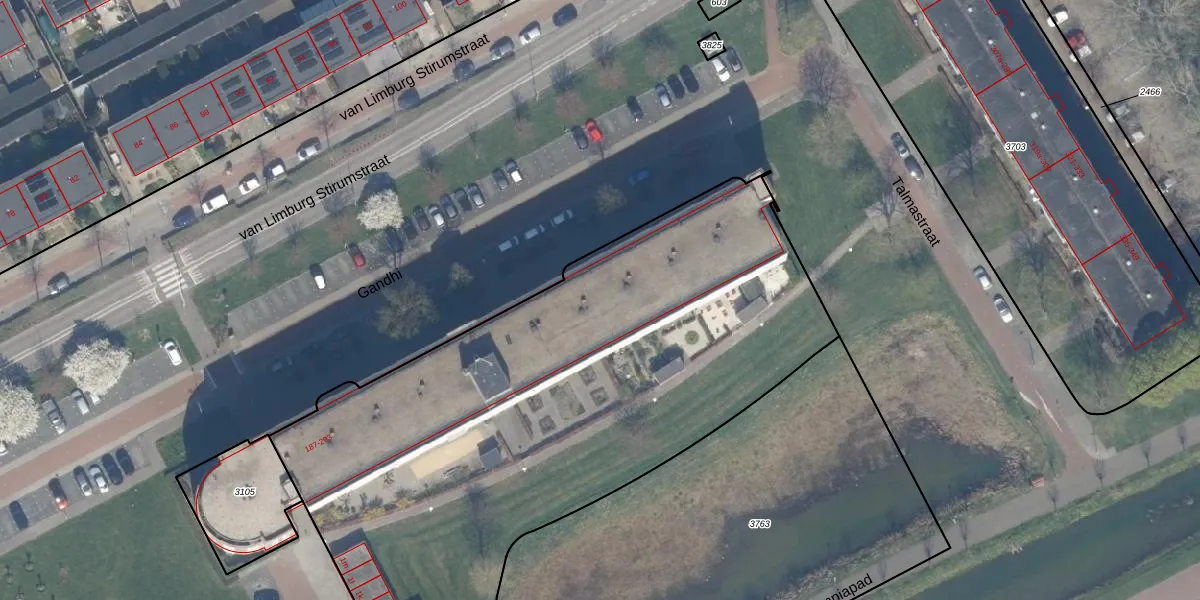Het perceel waarop Gandhi 257 staat heeft een oppervlakte van 6120 m². Dit is een zeer groot perceel. De perceeloppervlakte wordt geregistreerd door het Kadaster. Gedetailleerde informatie over de maten van dit perceel kunt u vinden in het rapport Kadastrale kaart met maatvoering van Gandhi 257.