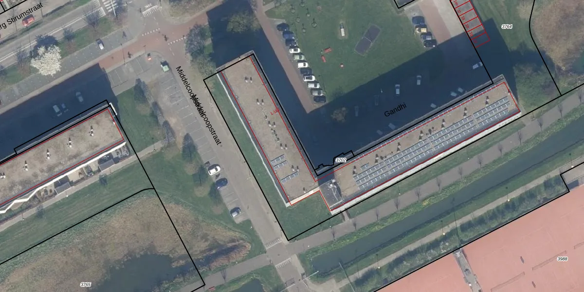 Het perceel waarop Gandhi 33 staat heeft een oppervlakte van 6120 m². Dit is een zeer groot perceel. De perceeloppervlakte wordt geregistreerd door het Kadaster. Gedetailleerde informatie over de maten van dit perceel kunt u vinden in het rapport Kadastrale kaart met maatvoering van Gandhi 33.
