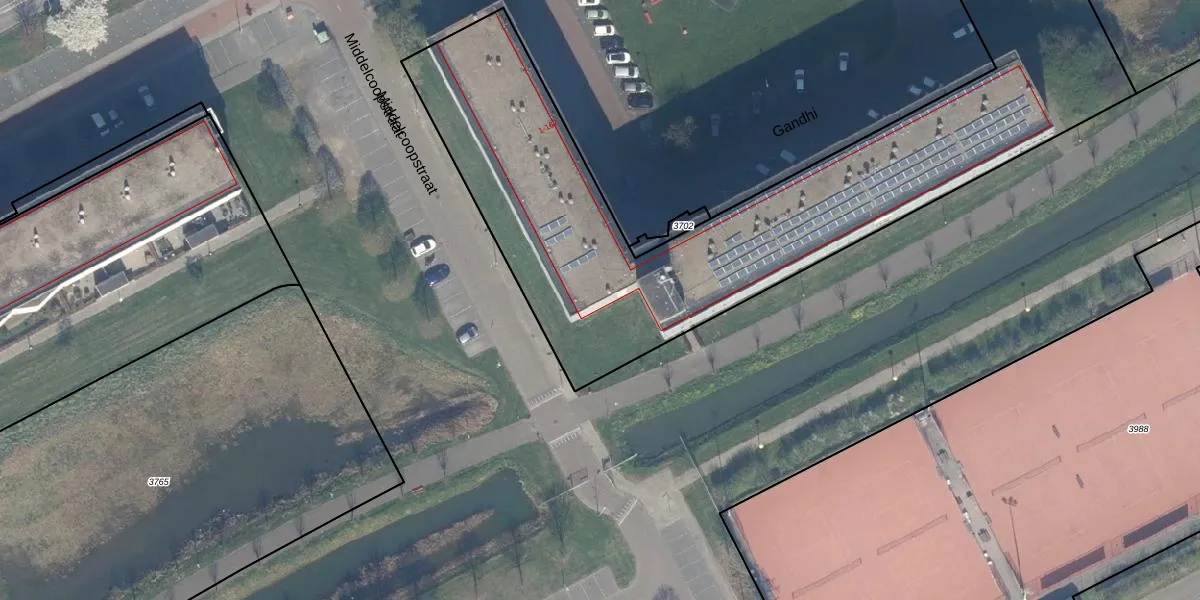Het perceel waarop Gandhi 77 staat heeft een oppervlakte van 6120 m². Dit is een zeer groot perceel. De perceeloppervlakte wordt geregistreerd door het Kadaster. Gedetailleerde informatie over de maten van dit perceel kunt u vinden in het rapport Kadastrale kaart met maatvoering van Gandhi 77.