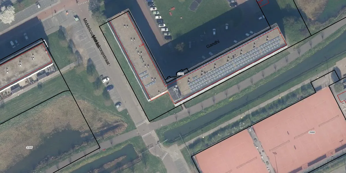 Het perceel waarop Gandhi 81 staat heeft een oppervlakte van 6120 m². Dit is een zeer groot perceel. De perceeloppervlakte wordt geregistreerd door het Kadaster. Gedetailleerde informatie over de maten van dit perceel kunt u vinden in het rapport Kadastrale kaart met maatvoering van Gandhi 81.