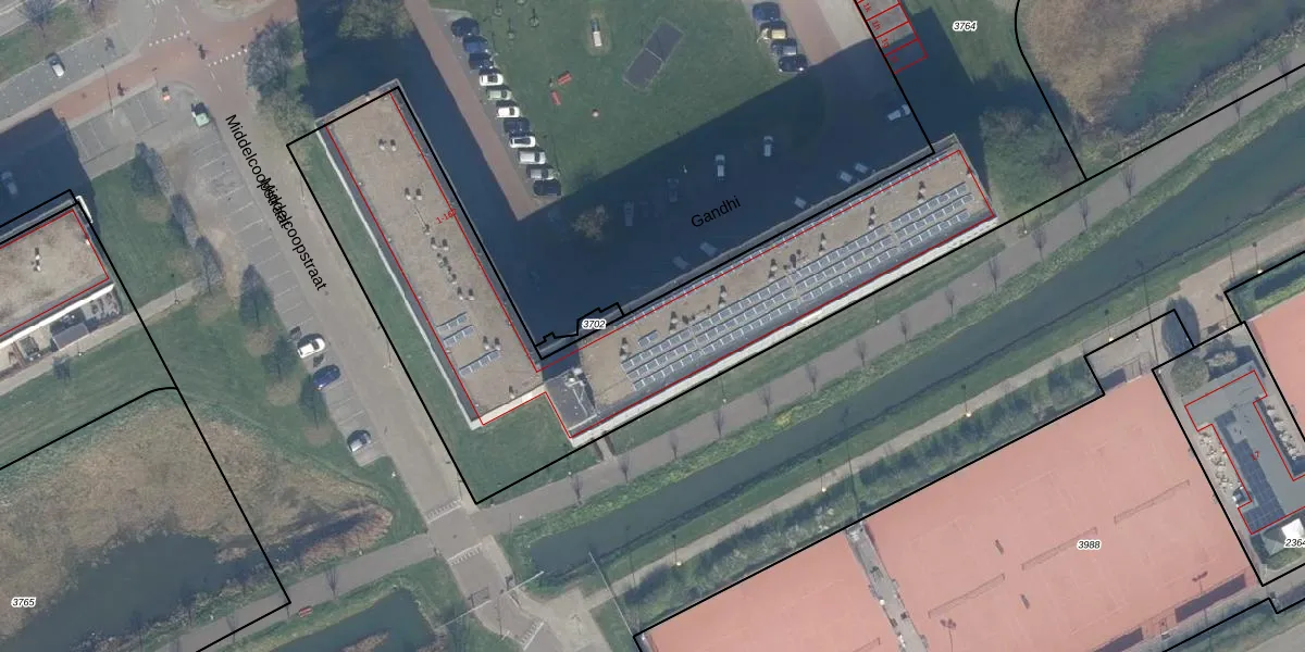 Het perceel waarop Gandhi 97 staat heeft een oppervlakte van 6120 m². Dit is een zeer groot perceel. De perceeloppervlakte wordt geregistreerd door het Kadaster. Gedetailleerde informatie over de maten van dit perceel kunt u vinden in het rapport Kadastrale kaart met maatvoering van Gandhi 97.
