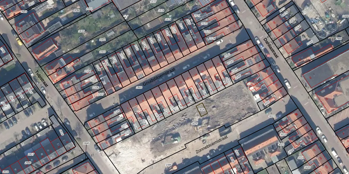Het perceel waarop Goudsbloemstraat 13 staat heeft een oppervlakte van 90 m². Dit is een klein perceel. De perceeloppervlakte wordt geregistreerd door het Kadaster. Gedetailleerde informatie over de maten van dit perceel kunt u vinden in het rapport Kadastrale kaart met maatvoering van Goudsbloemstraat 13.