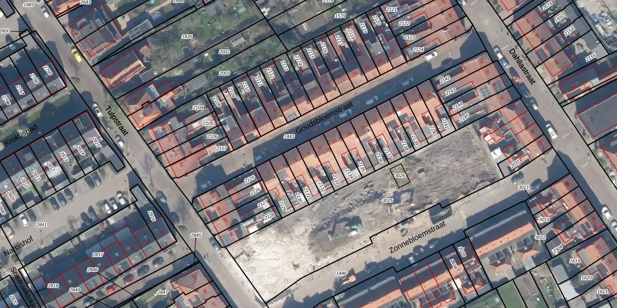 Het perceel waarop Goudsbloemstraat 7 staat heeft een oppervlakte van 91 m². Dit is een klein perceel. De perceeloppervlakte wordt geregistreerd door het Kadaster. Gedetailleerde informatie over de maten van dit perceel kunt u vinden in het rapport Kadastrale kaart met maatvoering van Goudsbloemstraat 7.
