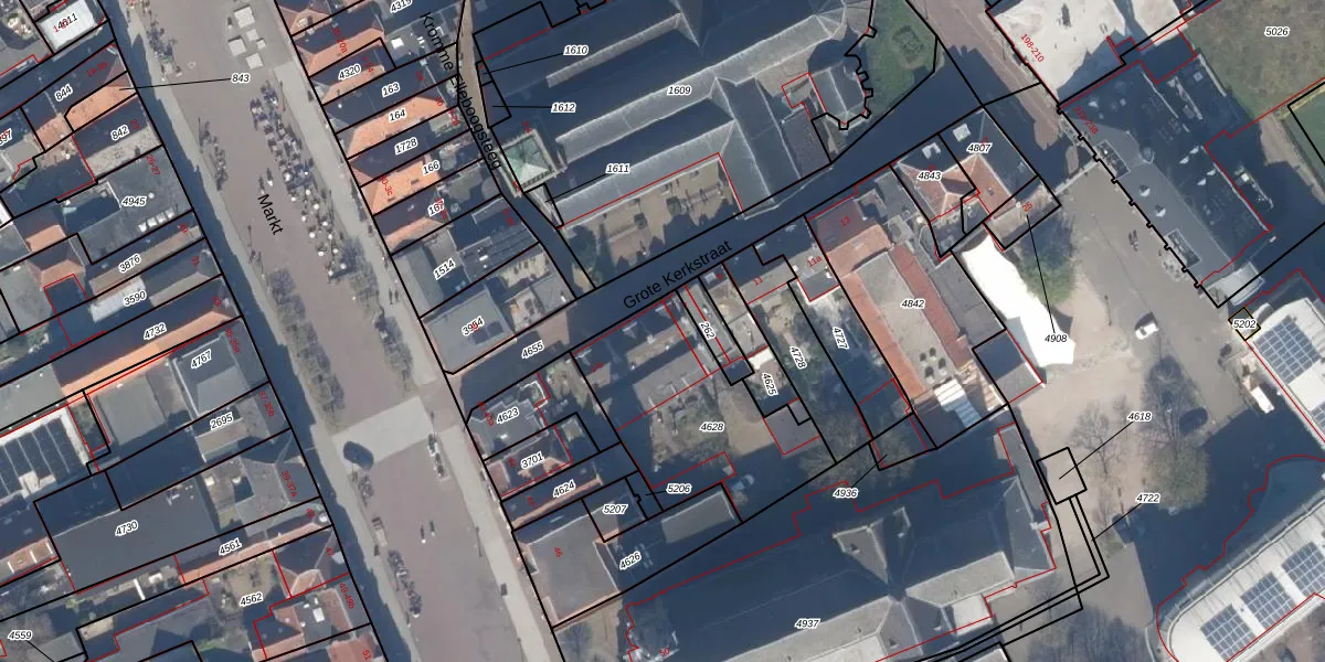 Het perceel waarop Grote Kerkstraat 5 staat heeft een oppervlakte van 696 m². Dit is een groot perceel. De perceeloppervlakte wordt geregistreerd door het Kadaster. Gedetailleerde informatie over de maten van dit perceel kunt u vinden in het rapport Kadastrale kaart met maatvoering van Grote Kerkstraat 5.