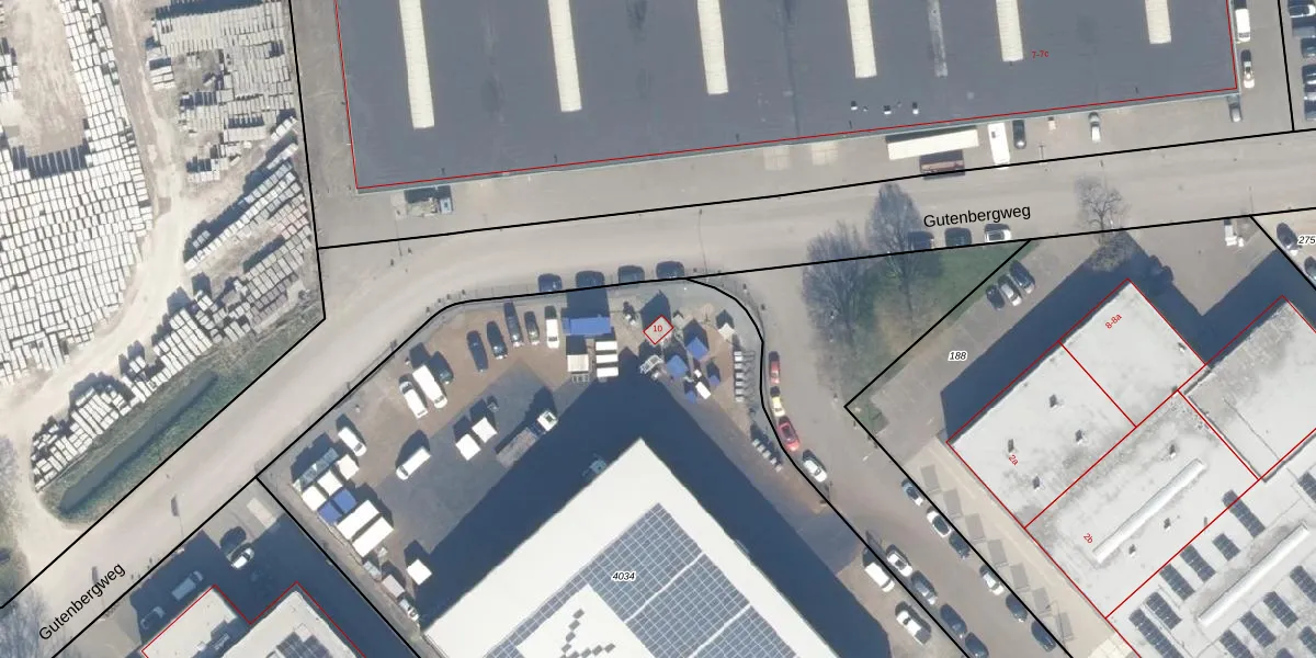 Het perceel waarop Gutenbergweg 10 staat heeft een oppervlakte van 5985 m². Dit is een zeer groot perceel. De perceeloppervlakte wordt geregistreerd door het Kadaster. Gedetailleerde informatie over de maten van dit perceel kunt u vinden in het rapport Kadastrale kaart met maatvoering van Gutenbergweg 10.