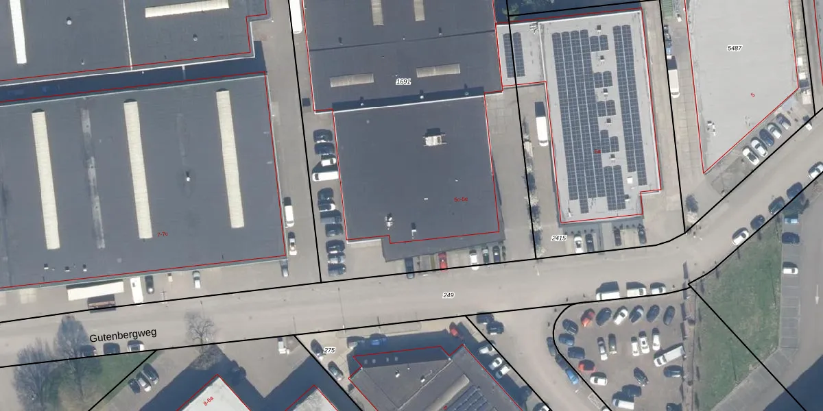 Het perceel waarop Gutenbergweg 5-d staat heeft een oppervlakte van 4280 m². Dit is een zeer groot perceel. De perceeloppervlakte wordt geregistreerd door het Kadaster. Gedetailleerde informatie over de maten van dit perceel kunt u vinden in het rapport Kadastrale kaart met maatvoering van Gutenbergweg 5-d.