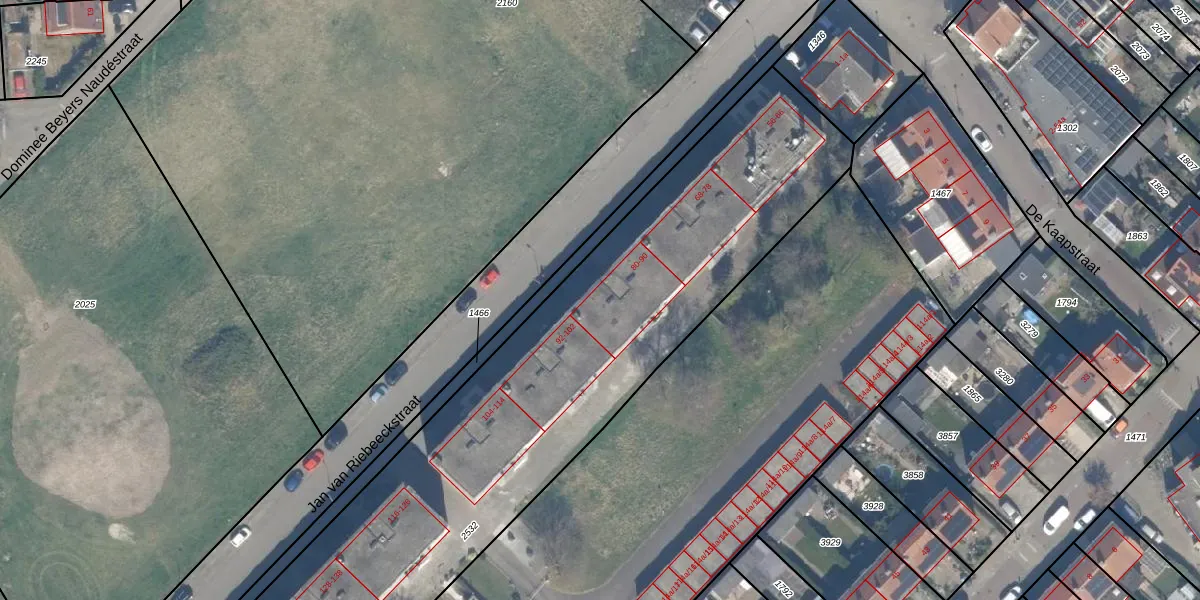 Het perceel waarop Jan van Riebeeckstraat 86 staat heeft een oppervlakte van 3815 m². Dit is een zeer groot perceel. De perceeloppervlakte wordt geregistreerd door het Kadaster. Gedetailleerde informatie over de maten van dit perceel kunt u vinden in het rapport Kadastrale kaart met maatvoering van Jan van Riebeeckstraat 86.