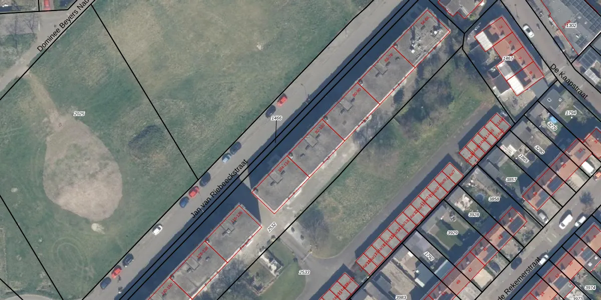 Het perceel waarop Jan van Riebeeckstraat 98 staat heeft een oppervlakte van 3815 m². Dit is een zeer groot perceel. De perceeloppervlakte wordt geregistreerd door het Kadaster. Gedetailleerde informatie over de maten van dit perceel kunt u vinden in het rapport Kadastrale kaart met maatvoering van Jan van Riebeeckstraat 98.